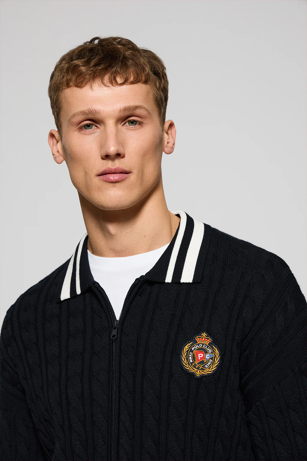 Navy-blue cable-knit cardigan with zip and nautical logo
