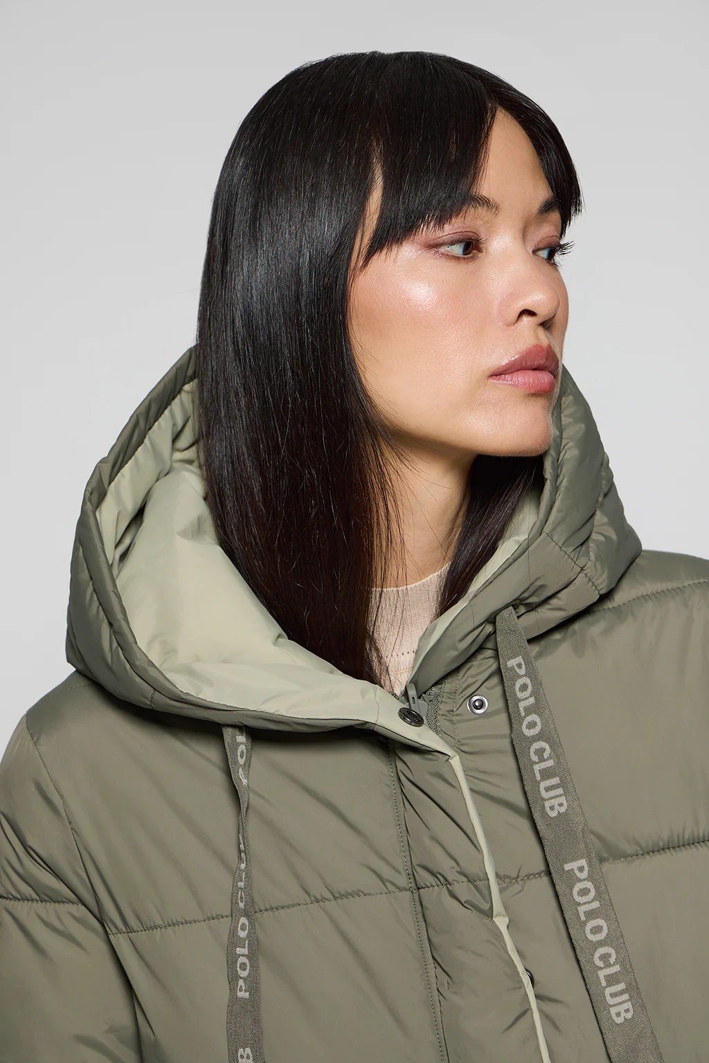 Reversible bicoloured coat (in green tones) for women. Its panelled outer and smooth lining in different hues have been designed to offer great versatility. The hood can be adjusted thanks to a Polo Club branded drawstring. With a central zip hidden by a placket made of the outer fabric with snap buttons for greater protection. Two outer and two inner pockets. No detail has been left to chance: the ribbons, pullers, buttonholes and branded details together with the sleeve rubber patch with twill base and the Polo Club print on the inner chest complete the look of the piece you’ll never want to take off this winter.