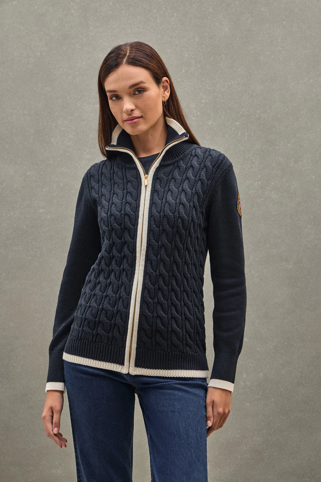 Navy-blue cardigan with Polo Club nautical patch