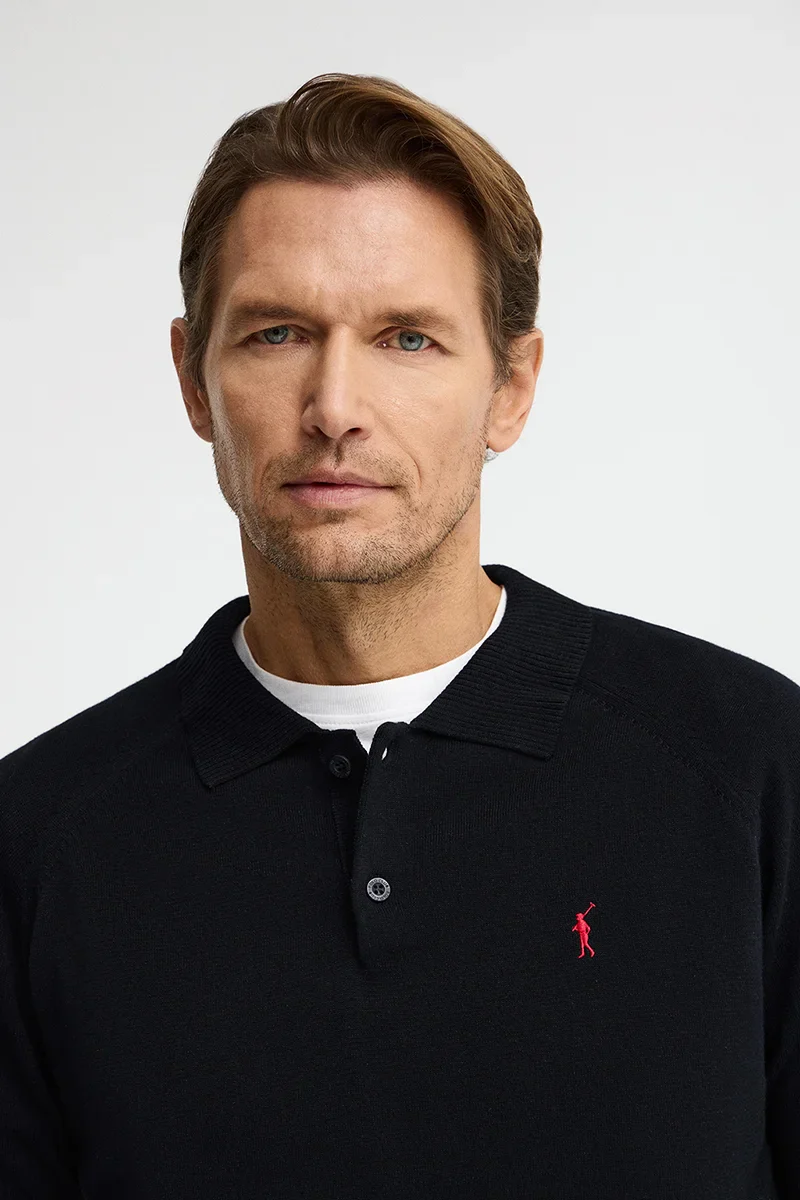 Navy-blue jumper with buttoned polo collar and Rigby Go logo