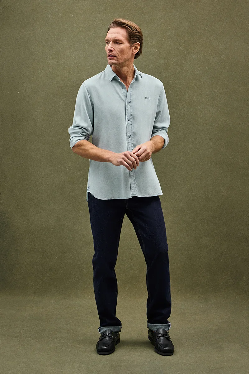 Men's long-sleeve shirt with regular fit and French collar. Made from Tencel, it brings lightness and a fluid drape, making it an airy option for summer.