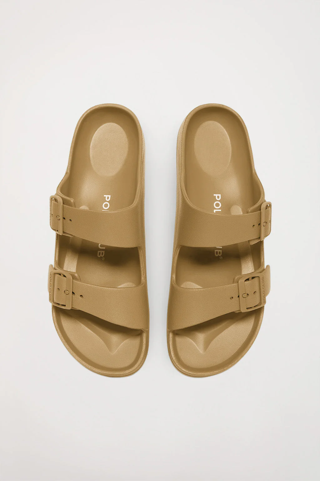 Bio sandals with open heel and buckles. These Bio style sandals, made of EVA materials, are a classic must-have. Thanks to their design inspired in the traditional cork sandal, you can wear them to go to the beach or for your wellness zone without giving up your style. Their branded buckles provide the best adjustment, and their waterproof material, washable and light, makes them the perfect all-terrain accessory. Buckle with plastic frame and pin.