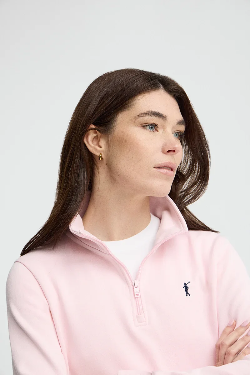 Pink sweatshirt with zipped neck and Rigby Go logo