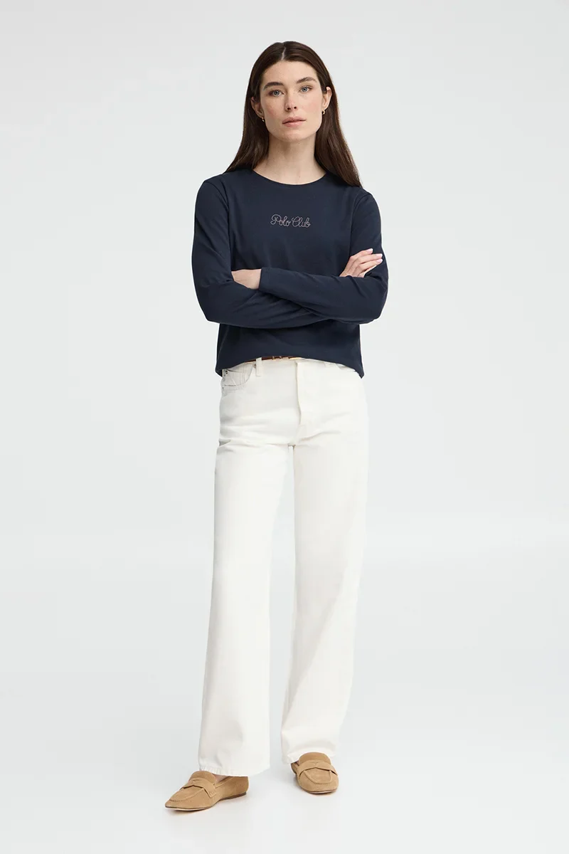 Navy-blue long-sleeve T-shirt with Polo Club rhinestones