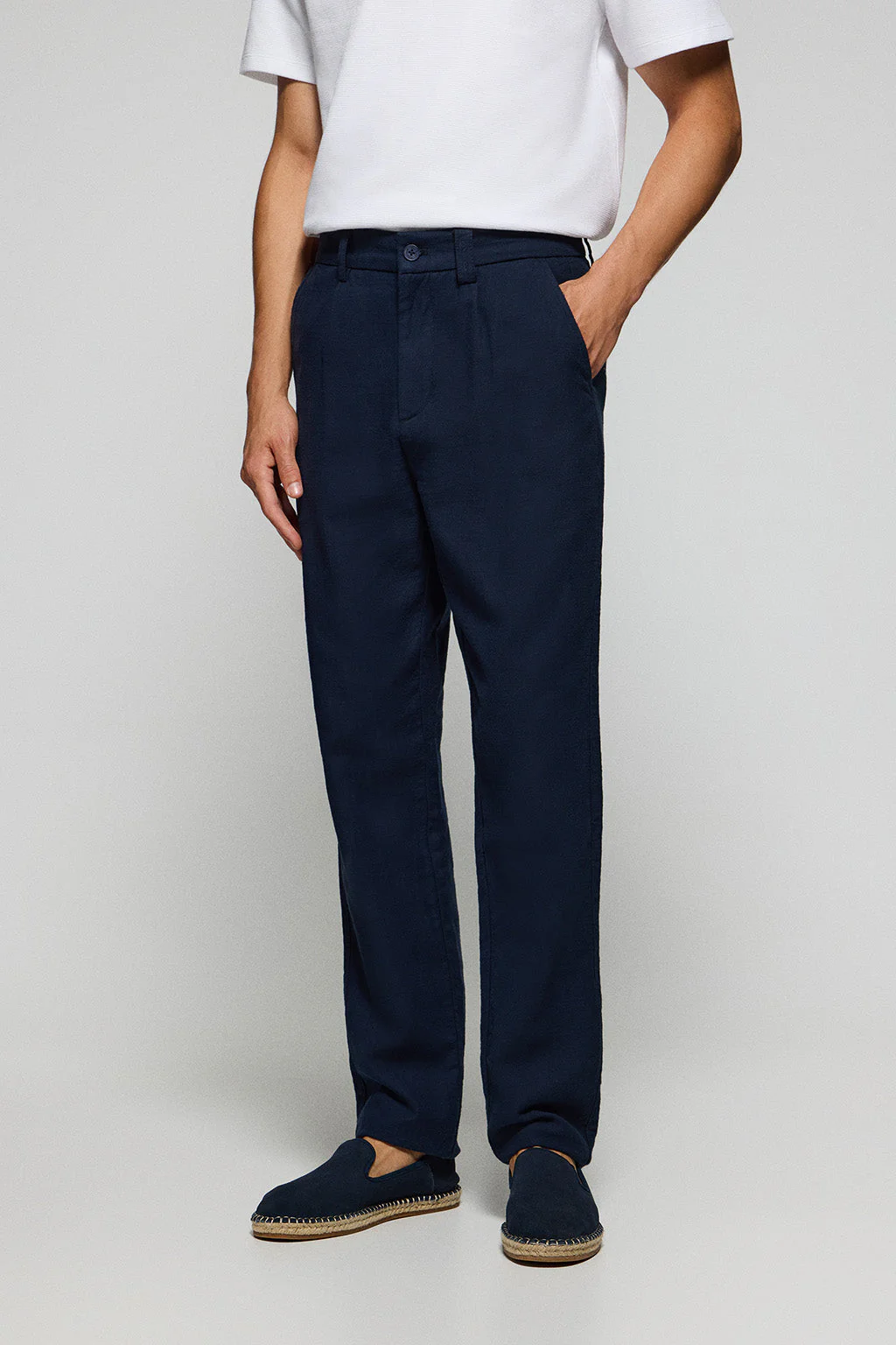 Our Cuba long trousers for men, made of cotton and linen, will become the must-have piece for the warmest days. Their regular fit with darts offers a classic and timeless look to elevate any outfit. Front zip fastening with customised tonal button. Two side and two back pockets. They stand out for their embroidery on the back pocket and on the front loop, in addition to its customised waistband.